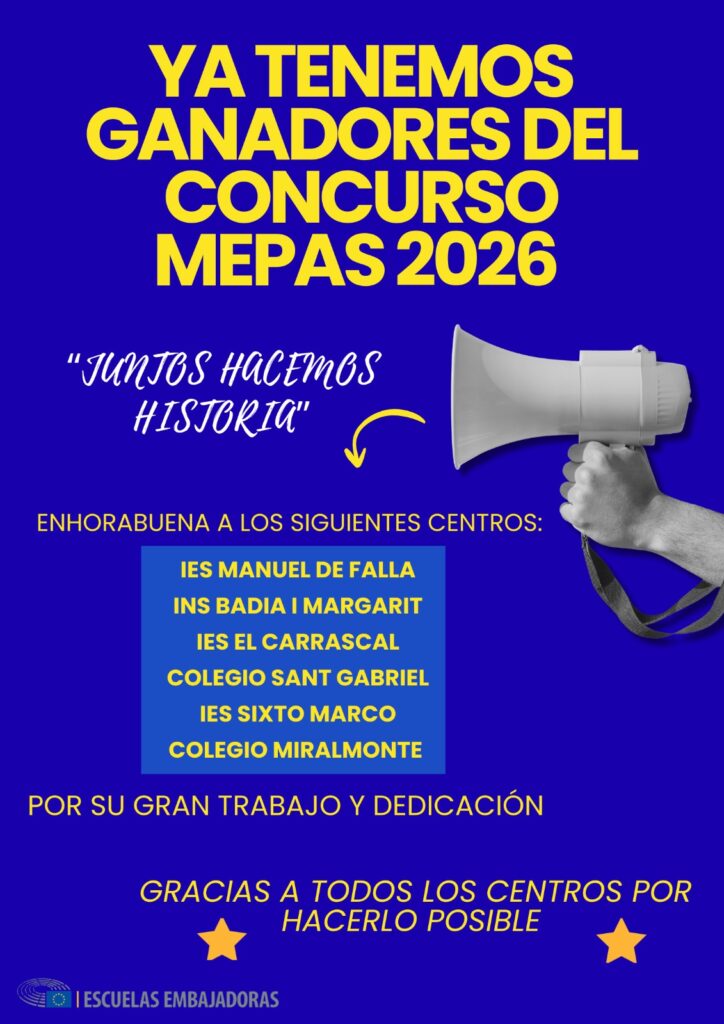 Tenim una gran notícia per compartir: el nostre col·legi ha estat un dels sis centres seleccionats a tot l’estat com a guanyador del concurs MEPAS (Escoles Ambaixadores Mentores del Parlament Europeu). Gràcies a aquest reconeixement, un grup d’alumnes de 4t d’ESO representarà el nostre col·legi en una trobada internacional que tindrà lloc a Madrid del 15 al 17 d’abril.